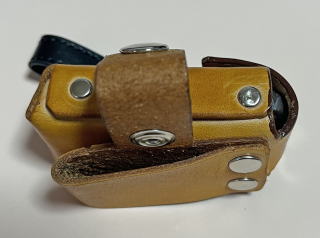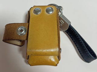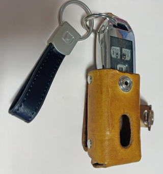 | 特徴 1,キーカバーを付けたままでケースにしまえる。 キーカバーは完全防水ではないが、防滴ぐらいはいけるもの。 2,ふたをジャンバースナップを付けて、キー本体の脱落防止機能付き。 3,キー本体側スイング機能付き。 縦に長いN-BOXキーは、ベルト幅より長めなので、 前傾姿勢をとった時に下腹部に刺さらないようにした。 これは、ドライバーとして多種なキーケースで実証済み。 4,キーケース本体脱落防止機能付き ズボンのベルトを外した時に、キー本体の重みでベルトからケース毎、 外れてしまうことがあるが それを防止する機能。ベルトループに、スナップで引っ掛けて使う。 5,全て、リベットで組み立て。 革用糸で縫うと、そこがウィークポイントになりかねない。 長く使うものだから、ほつれない様にした。 |