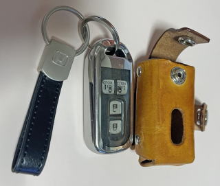| N-BOXキー用ベルトケース キーホルダーで、ベルトやベルトループ(ズボンのベルトを通すところ)にぶら下げるのが一般的であったが、、、 車のドアロックを解除する場合、手にとってSWを探さないといけない。 見た目もぶらぶらしてあまりカッコよろしくない。 よくトラックドライバーが腰に、ジャやらジャラさせてる、、 ならば、スマホベルトケースの様に、ベルトケースを作ればいいと思った。 ベルトに固定されていると、キーのSW位置決まっているので簡単にすばやくアクセスできる。 今回は、自分の中では良い出来と思う。 ま、今までに何個もベルトキーケースを作ってきて、最終形態だな! |