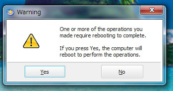 ![]() ▲んで、左上の「Apply」をクリックすると、、、 後で再起動することもできるが、チェックマークをつけないで、さっさと実行してしまいましょう♪ |