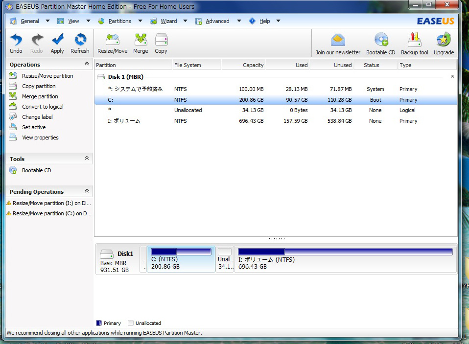 ![]() ▲次に、Cドライブの右端をマウスカーソールで掴んで、希望の容量になるまで右にスライドする。 上の画面では、200GBで止めている。 空き領域が出来てしまったので、I:ボリュームを左にずらす! |