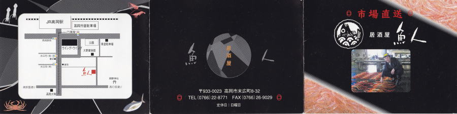 | ここの海鮮が新鮮だ! うまい! 激安な居酒屋ではないがうまい! 味と較べると、激安な居酒屋になるかも!! このページを見て来たといえば、もしかするとサービスがあるかも? かもだよ!?? 高岡の店で、初めてうまい海鮮を食べた! (すり身あげ、かに、刺身)かには、何も付けなくてもあまくておいしい! 関東では、酢をつけて食べてたな!また行きたい! 本当、こっちは海鮮がうまい! 肉なんか食べてる場合ではない! 2回目きたー! 刺身が甘い!! 本当うまいわ! ちょっと、今度、メニューもらってこようっと! そしてここで公開するしかない!! 関東で食べるなら、築地なんだけど、もっと高いかな? HPがないそうだ! だ、だから情報をのせとく、 〒933-0023 富山県高岡市末広町8-32 |